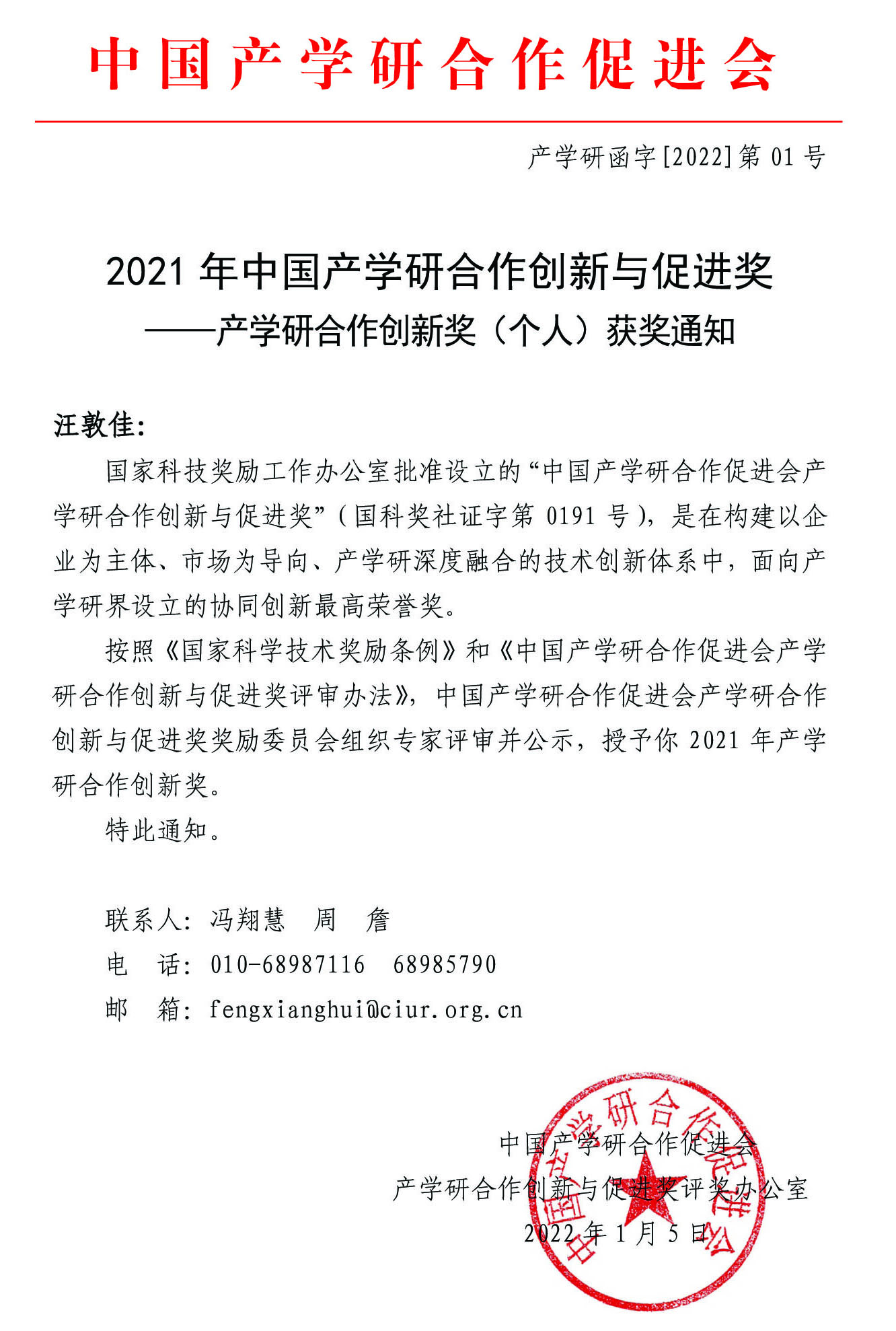 汪敦佳教授荣获“2021年中国产学研合作创新奖”