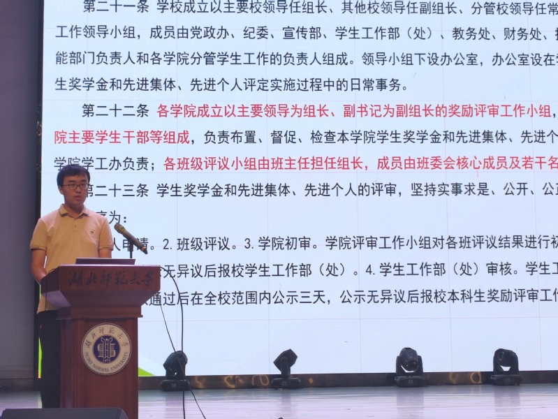 最后,辅导员郭先哲带领新生共同学习了《湖北师范大学本科生奖学金及荣誉称号评定办法(2021年修订)》等文件精神,他希望全体新生在学习中不断深入研究,尽快明确自己的大学目标,在学好第一课堂课程的同时,用好第二课堂课程体系,以促进自身能力的全面提高。