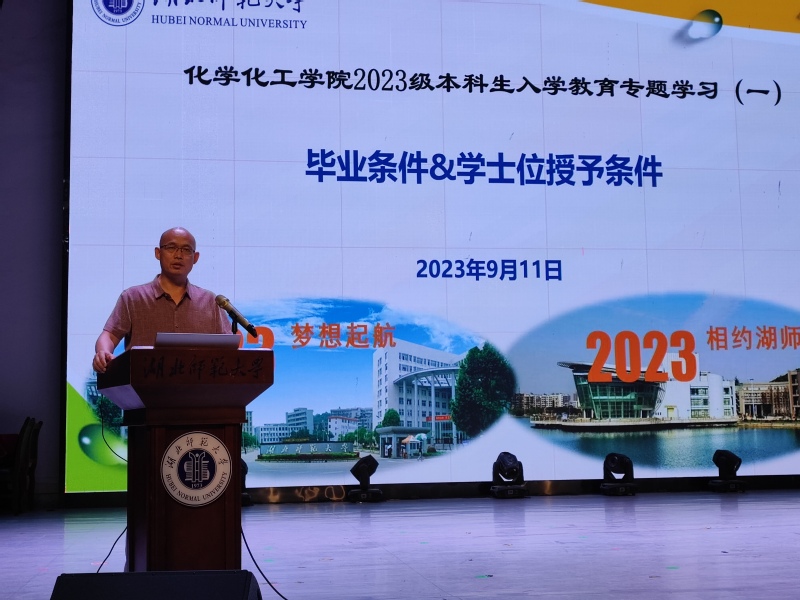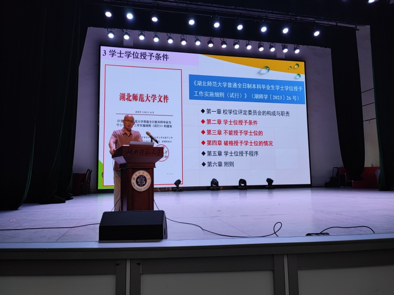 学校近日印发了新修订的《湖北师范大学普通全日制本科毕业生学士学位授予工作实施细则(试行)》,周兴旺副院长首先对此文件的相关精神进行了解读,他指出,严格大学生学位授予是落实高校“严进严出”的重要举措,也树立了狠抓学风的鲜明导向。周院长对学生所关注的毕业条件、授予学士学位条件、不能授予学士学位的情形、破格授予学士学位的条件等问题进行了详细讲解,并告诫全体新生务必转变观念,端正学习态度,掌握正确的学习方法,尽快适应大学的学习模式,为自己今后的发展打下坚实基础。