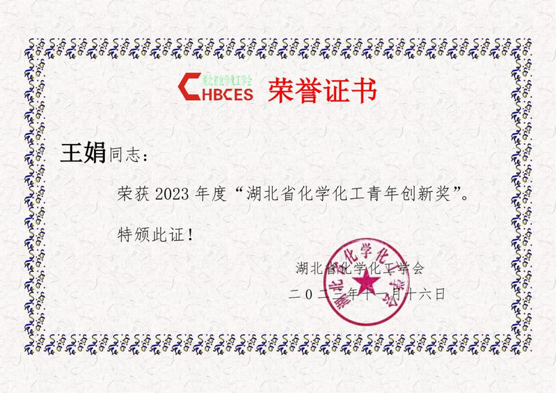 我院王娟博士荣获2023年度湖北省化学化工青年创新奖
