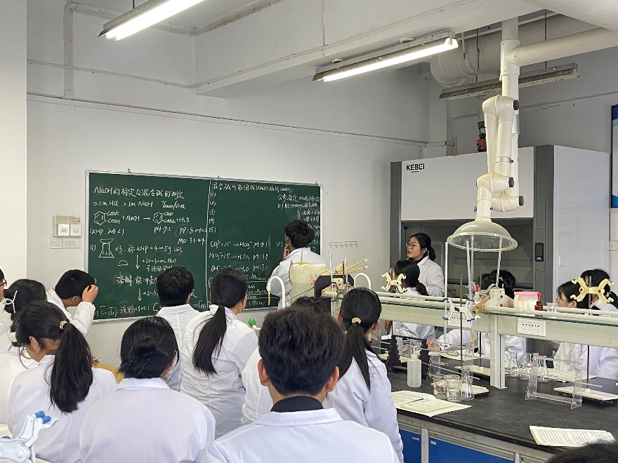 3月29日8:00至12:00,在化学大楼405教室,分析化学教研室余筱筱博士讲解示范课《分析化学实验(一)》,授课班级为化学23D03班。她运用讲授法、演示法和小组讨论法等混合式教学手段,围绕实验主题“NaOH的标定及混合碱的测定”,系统讲解了实验目的、原理、步骤以及注意事项,强调了吸量管的使用规范;此外,师生共同探讨归纳了双指示剂法判别混合碱组成的所有可能情况。本次示范课教学秩序井然,课堂氛围活跃,师生互动适中,课堂教学效果良好。