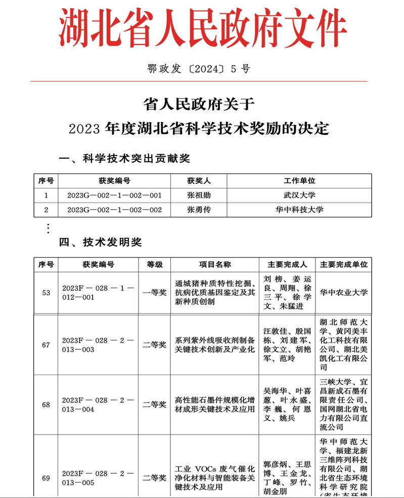 近日,湖北省人民政府印发《关于2023年度湖北省科学技术奖励的决定》(鄂政发〔2024〕5号),我院汪敦佳教授团队主持完成的“紫外线吸收剂制备关键技术创新及产业化”获湖北省技术发明奖二等奖。本次授予湖北省科学技术突出贡献奖、青年科技创新奖、自然科学奖、技术发明奖、科学技术进步奖和科技型中小企业创新奖共337项,其中技术发明奖28项。