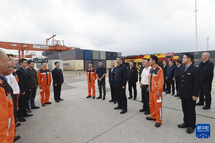 4月22日至24日,中共中央总书记、国家主席、中央军委主席习近平在重庆考察。这是22日下午,习近平在重庆国际物流枢纽园区重庆铁路集装箱中心站,同货车司机、列车司机、装卸工人、场站管理人员等亲切交流。新华社记者 王晔 摄