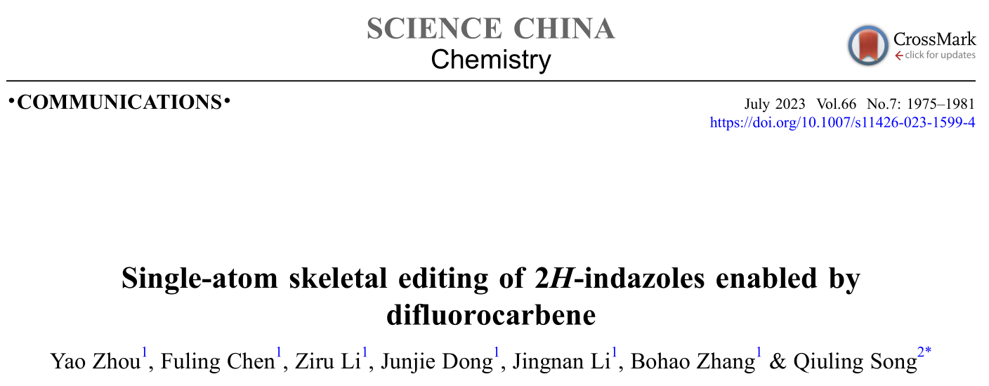 有机分子的后期修饰可以大大增加分子的结构多样性,长期以来,C-H键官能团化是生物活性分子后期修饰的常用手段,可以为药物分子的筛选提供多样的先导化合物。相比于C-H键官能团化的后期修饰,直接对芳香杂环或碳骨架进行特定原子的消除和插入极具挑战性。二氟卡宾作为缺电子的活泼中间体,其直接参与碳环及杂环的分子骨架编辑尚无成功的案例。基于此,该研究利用溴二氟乙酸乙酯作为二氟卡宾的来源,实现了2H-吲唑化合物N-N键断裂的扩环反应,在温和的条件下实现了吲唑化合物的分子骨架编辑。该成果于20235月发表于中科院SCI大类一区、综合性化学学术期刊Science China ChemistryIF9.6,周耀副教授为论文第一作者,福州大学宋秋玲教授为通讯作者,湖北师范大学为论文第一通讯单位。