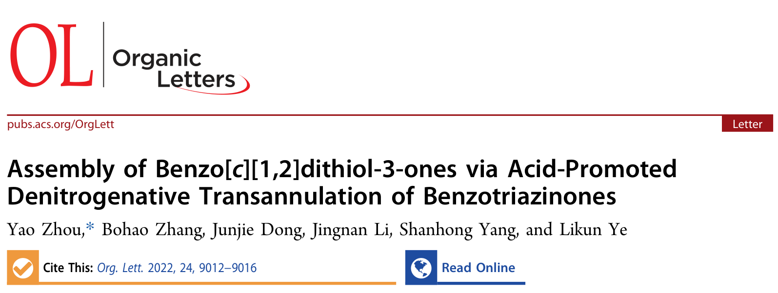 氮杂环的脱氮环化反应可以为复杂药物分子及天然产物的合成提供了强大的合成策略。目前苯并三嗪酮的活化主要依赖于过渡金属催化,无金属催化苯并三嗪酮的脱氮气反应极其罕见,简单的酸或碱促进苯并三秦酮的脱氮气开环反应仍然有待开发。基于此,该研究开发了乙酸促进苯并三嗪酮的“断裂-脱除-环化”反应。相比于链状对称或非对称的二硫化合物,环状二硫化合物的构建仍然具有一定的合成挑战性。该研究在无过渡金属的条件下,实现了环状S-S键的形成,为苯并二磺酚酮的构建提供了全新的合成路线。该成果于202212月发表于中科院SCI大类一区、自然指数期刊Organic LettersIF5.2,周耀副教授为论文第一作者及通讯作者,湖北师范大学为论文唯一通讯单位。