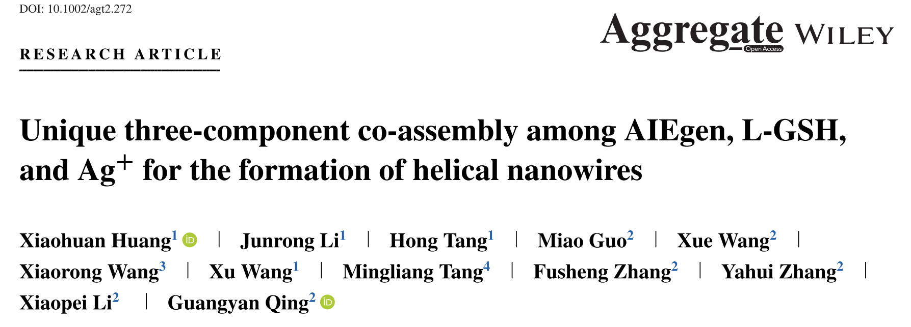 “化学自组装之路能够走多远?”被《科学》杂志列为21世纪最需要解决的25个科学问题之一。该研究报道了一个独特的三元共组装体系。首先,通过荧光的方法对三组分的类似物进行了广泛的筛选,结果显示AIE分子、L-GSHAgNO3的三元组装体系具有高度的精准性和特异性。其次,三元共组装表现出独特的螺旋结构,表明分子手性转移和放大到超分子螺旋手性。 第三,它通过显著的荧光增强给出了快速、直观、方便的信号输出,提供了一种快速确定最佳组装体的方法。工作将推动超分子纳米组装向更精确的方向发展 。该成果于20232发表在中科院大类分区一区期刊AggregateIF18.8黄小欢教授为论文第一作者及通讯作者中科院大连化物所卿光焱研究员为共同通讯作者,湖北师范大学为论文第一通讯单位