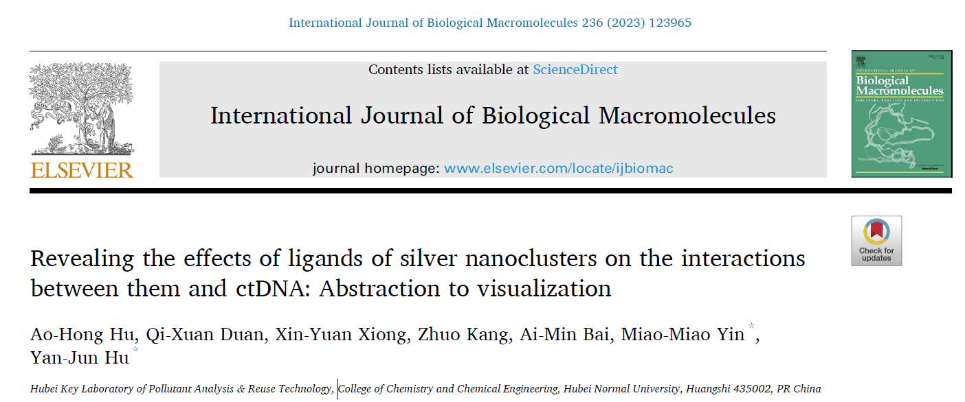 银纳米团簇在生物医药领域被广泛应用。DNA是遗传信息的载体。银纳米团簇是否会影响DNA的结构和性质?该研究采用多种方法,从宏观到微观研究了谷胱甘肽和二氢硫辛酸修饰的银纳米团簇与小牛胸腺DNA的相互作用,揭示了表面配体对银纳米团簇与DNA相互作用的影响机制和规律。该成果于20233月发表于中科院SCI大类一区期刊International Journal of Biological MacromoleculesIF8.2,2020级硕士研究生胡傲虹为第一作者,尹苗苗博士和胡艳军教授为共同通讯作者,湖北师范大学为该论文唯一通讯单位。