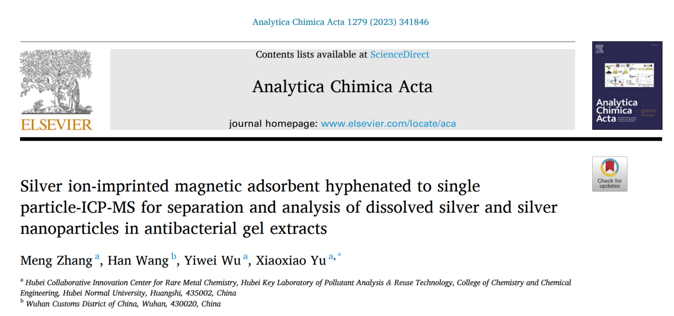 含银抗菌产品的大量使用,导致Ag NPs被释放到环境中,但其易氧化成溶解态Ag(I)。然而,共存的溶解态Ag(I)会导致SP-ICP-MS的基线信号较高,掩盖较小尺寸的Ag NPs该研究合成了一种新型银离子印迹磁响应吸附剂,能选择性吸附Ag(I),却几乎不吸附Ag NPs,吸附容量高(149 mg·g-1),吸附动力学快(30 min),在μg·L-1 mg·L-1共存浓度范围皆可使用,且可重复使用至少5次。选择性去除Ag(I)后,SP-ICP-MS测定Ag NPs的粒径和粒子浓度的检测限低至12.6 nm6.3×105 particle L-1。已成功应用于分析抗菌凝胶中Ag(I)Ag NPs,并通过酸消解-ICP-MSTEM和加标实验验证了方法的准确性。该成果于20239月发表于中科院SCI大类一区期刊Analytica Chimica ActaIF6.2,2021级硕士研究生张萌为论文第一作者,余筱筱博士为通讯作者,湖北师范大学为论文唯一通讯单位。