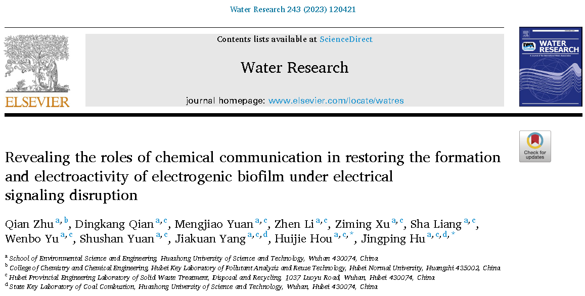 生物电化学系统(MES)中多种信号通讯方式间相互作用的研究仍处于起步阶段。该研究证实了在电信号通讯阻滞下,胞内c-di-GMP信号通讯自发得到强化;阐明了在电信号通讯阻滞下,外源N-酰基高丝氨酸内酯有助于修复电活性生物膜形成和电化学活性,但会削弱c-di-GMP的优势。研究结果表明钾离子通道阻断剂和外源N-酰基高丝氨酸内酯均能诱导产电菌Geobacter的选择性富集。该成果于2023年7月发表于中科院SCI大类一区、自然指数期刊Water Research(IF:12.8),朱倩博士为论文第一作者,华中科技大学侯慧杰教授和胡敬平教授为共同通讯作者,华中科技大学和湖北师范大学分别为论文第一、第二通讯单位。