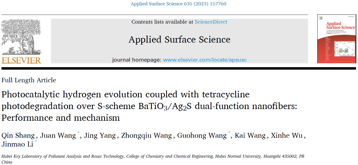 利用太阳能析氢耦合降解污染物是一种解决环境污染和能源短缺非常有效的战略。该研究通过静电纺丝和水热法制备新型双功能BaTiO3/Ag2S S型纳米纤维,用于高效光催化析氢耦合污染物降解。优化后的BaTiO3/Ag2S S型复合纳米纤维的光催化析氢性能为133 μmol·h-1·g-1,同时在3 h内耦合降解57.9%的四环素。密度泛函理论计算和实验结果证明了BaTiO3/Ag2S体系遵循S型电子转移机制,显著地促进了载流子分离。因此,该工作为设计高效双功能光催化剂提供一些有用的提示。该成果于2023年6月发表于中科院SCI大类一区期刊Applied Surface Science(IF:6.7),2020级硕士研究生商琴为论文第一作者,王娟副教授、王国宏教授和李金懋博士为论文共同通讯作者,湖北师范大学为论文唯一通讯单位。