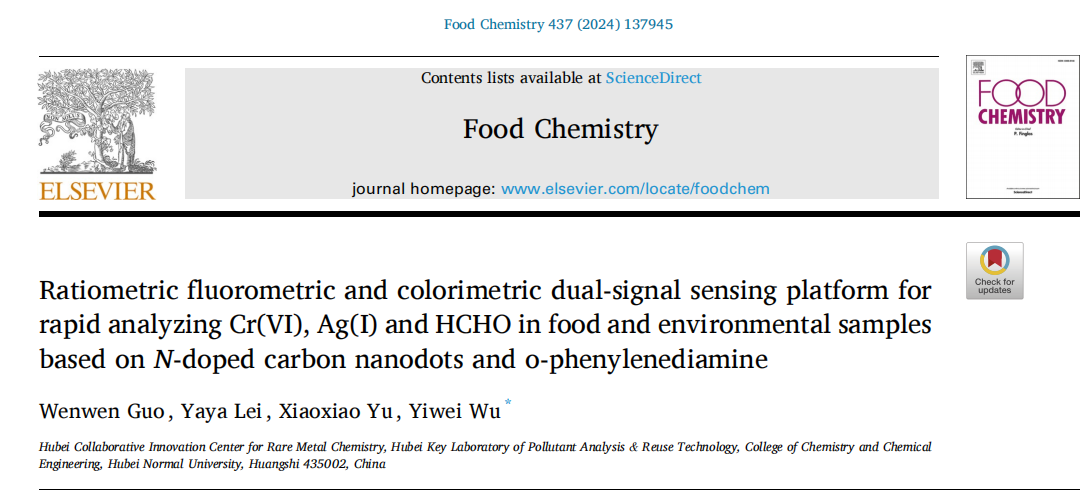 该研究提出了一种基于氮掺杂碳量子点(CDs)和邻苯二胺(OPD)的双信号传感检测新方法,可高效检测Ag(I)、Cr(Ⅵ)和HCHO,其优点为:通过简单、环保的过程合成了具有良好光学和化学稳定性的CDs;具有比例荧光和比色双模式,使检测结果更加可靠;基于CDs的双策略在样品中具有良好的Ag(I)、Cr(Ⅵ)和HCHO检测潜力。该成果于2023年11月发表于中科院SCI大类一区期刊Food Chemistry(IF:8.8),2020级硕士研究生郭雯雯为论文第一作者,吴一微教授为通讯作者,湖北师范大学为论文唯一通讯单位。