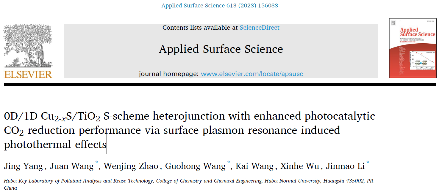 提高光吸收能力和电荷分离效率对TiO2基光催化剂实现高效光还原CO2具有重要意义。该研究通过溶剂热法制备了新型0D/1D Cu2-xS/TiO2 S型光催化剂。优化后的Cu2-xS/TiO2光催化剂CH4的产率为14.1 μmol•h-1,是纯TiO2的3.9倍。密度泛函理论计算和实验分析证明了S型异质结显著提高了电荷分离效率。利用Cu2-xS的表面等离子体共振效应,Cu2-xS/TiO2光催化剂在全光谱下表现出显著的光热效应。此外,利用原位傅里叶变换红外光谱研究了Cu2-xS/TiO2光热还原 CO2的可能机制。因此,该工作为设计全光谱响应光热协同CO2还原催化剂提供了一些启示。该成果于2022年12月发表于中科院SCI大类一区期刊Applied Surface Science(IF:6.7),2021级硕士研究生杨婧为论文第一作者,王娟副教授、王国宏教授和李金懋博士为论文共同通讯作者,湖北师范大学为论文唯一通讯单位。
