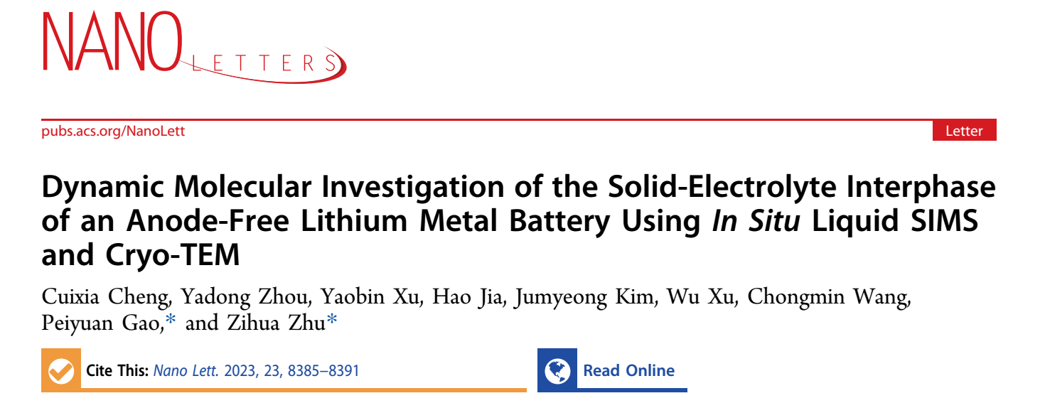 影响锂离子电池性能的因素之一是阳极表面与电解质相层SEI的形成及其稳定性。致密稳定的SEI膜不仅可以阻止电解质的分解,还能调节锂沉积并阻碍锂枝晶生长,从而确保电极在充放电过程中的循环稳定性和安全性。然而有关SEI的形成动力学、分子性质和空间构型等尚未完全了解。人们对SEI的了解有限主要是因为SEI膜薄容易受到光束的破坏,而且对空气中的水分和氧气极为敏感,这就导致利用最常见的原位显微镜和光谱分析SEI膜时,SEI可能会在不经意间被改变或转换成不同的形式。该研究利用原位二次离子质谱和低温冷冻透射电镜,结合密度泛函理论计算,描述了实时工作条件下SEI形成及其演变。该成果于2023年9月份发表在中科院SCI大类一区、自然指数期刊Nano Letters(IF:10.8),程翠霞副教授为第一作者,美国西北太平洋国家实验室的高培元和朱梓华老师为共同通讯作者,湖北师范大学为该论文第一通讯单位。