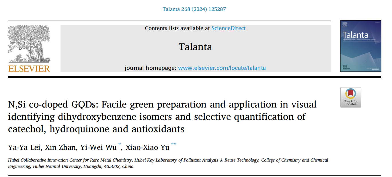 首先,N,Si-GQDs可以视觉识别二羟基苯的三种异构体。与HPLC相比,该方法为鉴别二羟基苯异构体提供了一种更简单、更经济、更方便的方法。此外,成功开发了一种“Off/On”传感器,用于选择性定量检测环境水中的邻苯二酚/对苯二酚和人体血清中的抗氧化剂(AA/GSH)。该传感器在环境和生物医学分析中具有巨大的实际应用潜力。该成果于2023年10月发表于中科院SCI大类一区期刊Talanta(IF:6.1),2021级硕士研究生雷娅娅为论文第一作者,吴一微教授和余筱筱博士为论文共同通讯作者,湖北师范大学为论文唯一通讯单位。