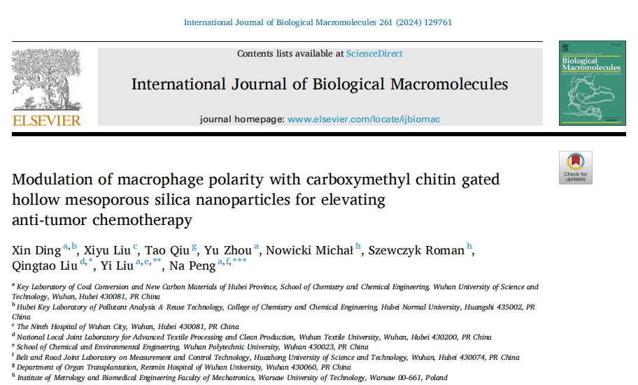 日前,国际知名期刊International Journal of Biological Macromolecules(《国际生物大分子》)发表了我院丁鑫博士在生物化学领域的最新研究成果。论文题为“Modulation of macrophage polarity with carboxymethyl chitin gated hollow mesoporous silica nanoparticles for elevating anti-tumor chemotherapy”(羧甲基甲壳素门控的中空介孔二氧化硅纳米颗粒调节巨噬细胞极化提高抗肿瘤化疗)。丁鑫博士为论文第一作者,武汉科技大学刘义教授和彭娜教授为共同通讯作者,武汉科技大学、湖北师范大学分别为论文第一、第二通讯单位。International Journal of Biological Macromolecules是一本公认的研究所有天然大分子的化学和生物方面的国际杂志,中科院SCI化学大类一区,最新影响因子为8.2。