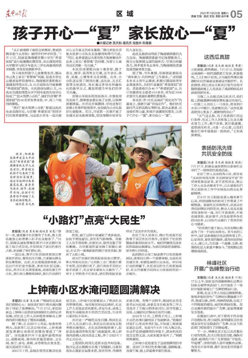 7月20日,《东楚晚报》第五版报道了我院星火筑梦小分队的支教工作。该实践队由化院、美术、文学、数统等多个学院学生组成,前往阳新县官塘小学开展为期3周的暑期支教活动。本次共招收73名小学生,根据其年龄段开设低、中、高三个年级班,指导教师为我院负责团学工作辅导员郭先哲。