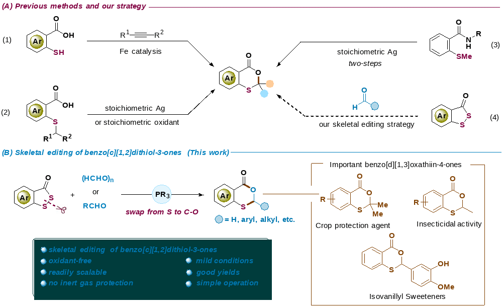 有机分子的后期修饰可以大大增加分子的结构多样性长期以来,C–H键官能团化是生物活性分子后期修饰的常用手段,可以为药物分子的筛选提供多样的先导化合物。相比于C–H键官能团化的后期修饰,直接对芳香杂环或碳骨架进行特定原子的消除和插入极具挑战性。分子骨架编辑作为自然界创造活性天然产物结构多样性的重要合成工具,如果能对杂环及碳环的核心骨架进行直接编辑,比如消除、替换或者插入特定的原子,则可能改善或者完全改变分子的物化性质、生物活性、药学性质等,为药物活性分子的开发提供强劲的合成策略。目前苯并二磺酚酮分子骨架编辑反应的研究极其罕见。基于此,周耀博士研究团队报道了有机磷介导苯并二磺酚酮的分子骨架编辑反应,实现了苯并二磺酚酮的S原子交换反应,在温和的条件下合成一系列官能团化的1,3-苯并恶硫因-4-酮衍生物。