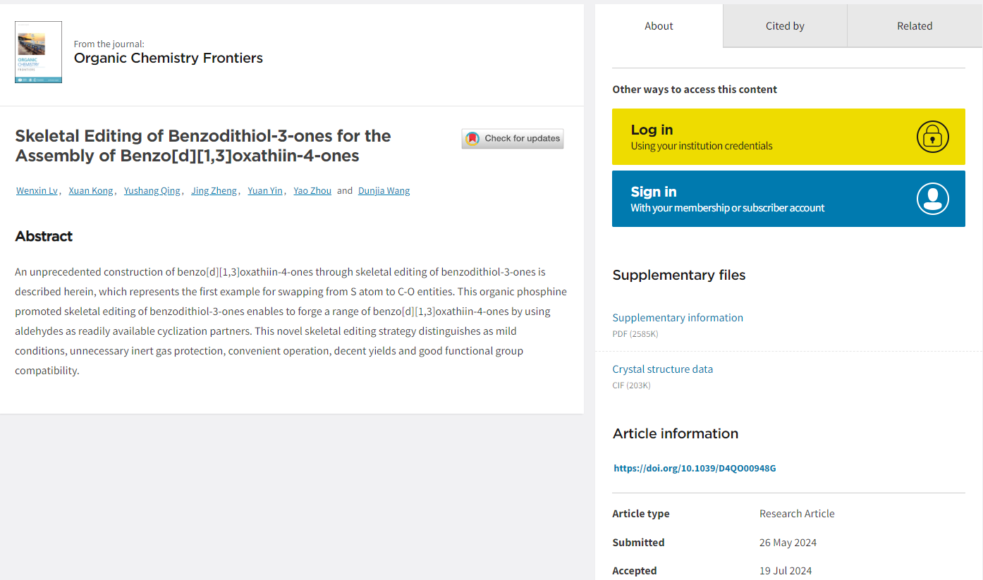 近日,国际知名期刊Organic Chemistry Frontiers(《有机化学前沿》)在线发表了我院周耀副教授团队在分子骨架编辑领域的最新研究成果。论文题为“Skeletal Editing of Benzodithiol-3-ones for theAssembly of Benzo[d][1,3]oxathiin-4-ones”(苯并二磺酚酮的分子骨架编辑构建1,3-苯并恶硫因-4-酮)。我院2021级硕士研究生吕文鑫和2023级硕士研究生孔暄为论文共同第一作者,周耀博士为论文通讯作者,湖北师范大学为论文唯一通讯单位。Organic Chemistry Frontiers是Royal Society of Chemistry(英国皇家化学会)与中国化学会、中国科学院上海有机化学研究所合作出版的以CHEMISTRY, ORGANIC综合研究为特色的国际期刊、SCI中科院大类一区期刊,最新影响因子为4.6。