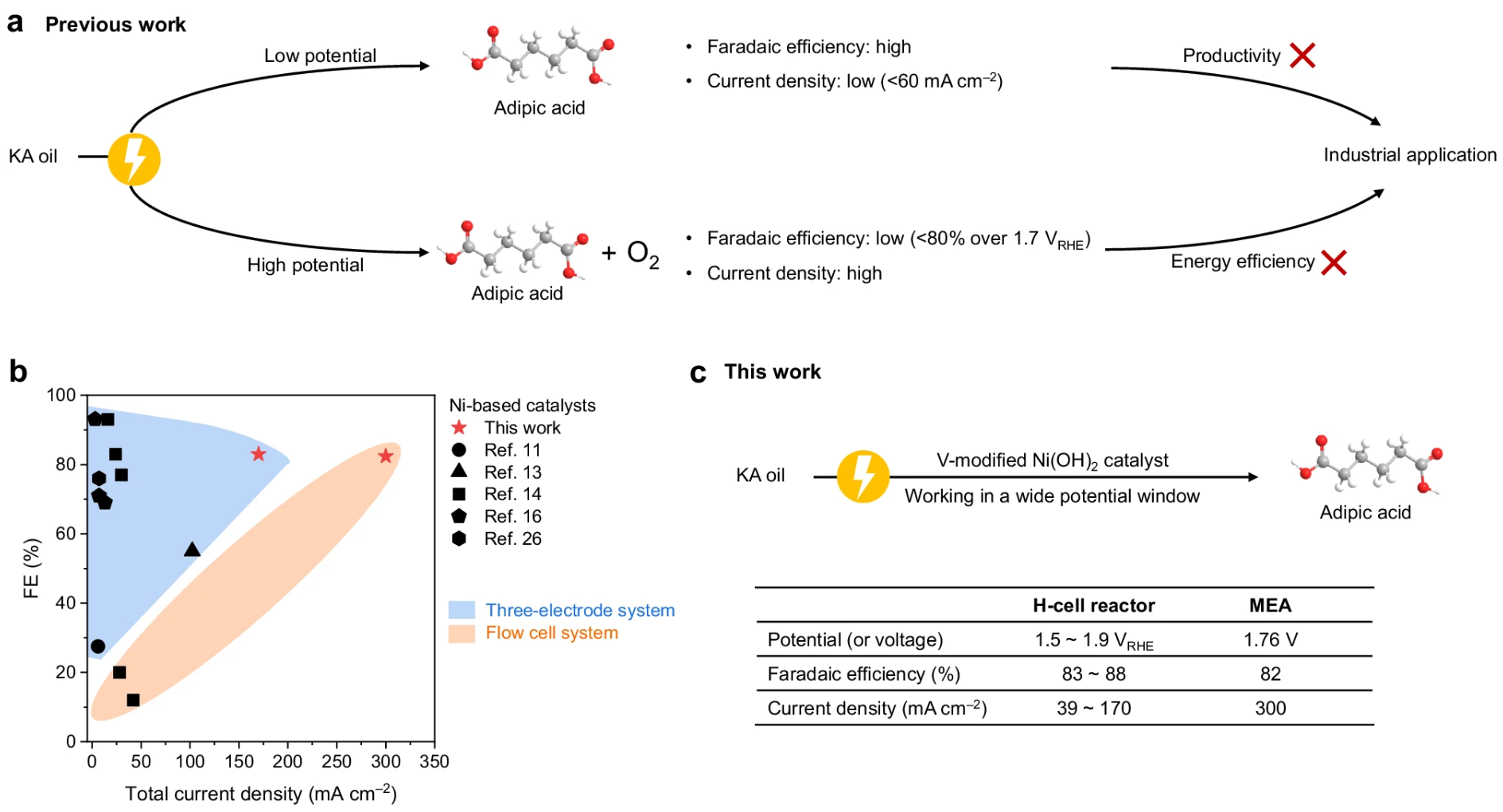 该研究开发了一种具有较高工业潜力的高效己二酸电合成催化剂。己二酸是最重要的脂肪族二羧酸之一,主要用于生产尼龙-66、聚酰胺及其他聚合物。采用环己醇和环己酮的混合物(即KA油)电催化合成己二酸被视作为一种可持续策略,可以取代需要严苛反应条件的传统方法。然而,其在工业上应用的可能性受到了低电流密度和竞争的析氧反应的极大限制。该论文报道了一种钒修饰镍基氢氧化物超薄纳米片(NiV-LDH-NS),在电氧化KA油制备己二酸的反应中,能够在宽电位窗口内(1.5~1.9 V vs. RHE)保持高法拉第效率(>80%),实现了大电流密度下己二酸的连续生产。实验及理论研究揭示了钒修饰的两大关键作用:其一,加速了催化剂的重构;其二,增强了环己酮在催化剂表面的吸附。另外,基于此构建的膜电极组件(MEA),在工业级电流密度(300 mA cm-2)下,已二酸生产的法拉第效率达到82%,生产速率则高达1536 μmol cm-2 h-1,且可以稳定运行50小时以上。