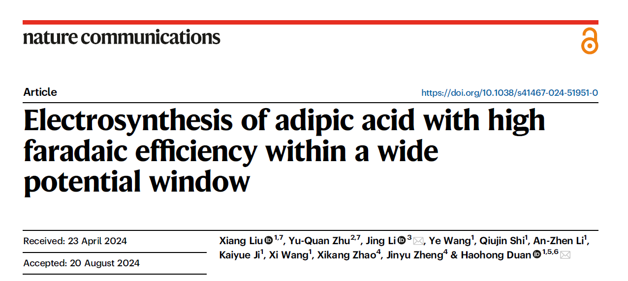 近日,国际顶级期刊Nature Communications(《自然·通讯》)在线刊发了物理化学教研室朱玉荃博士的最新学术论文,论文题为“Electrosynthesis of adipic acid with high faradaic efficiency within a wide potential window”(宽电位窗口内高法拉第效率电合成己二酸),朱玉荃博士为论文共同第一作者,清华大学、湖北师范大学分别为论文第一、第二通讯单位。Nature Communications是Nature旗下综合性子刊,是SCI中科院大类一区TOP期刊,最新影响因子为16.6。
