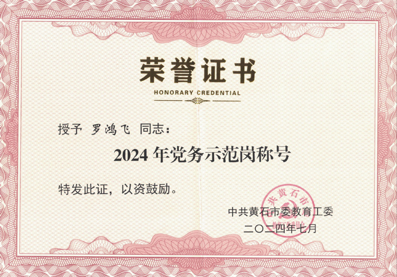日前,中共黄石市委教育工委发文表彰2024年党员先锋岗,我院党委书记罗鸿飞同志荣获黄石市教育系统2024年党务示范岗称号。