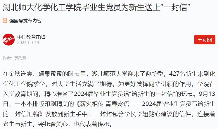 在金秋送爽、硕果累累的时节里,湖北师范大学迎来了迎新季,427名新生来到betway西汉姆联官网求学,对大学生活充满了期待。为更好发挥同辈引领的作用,学院在入学教育期间,精心准备了2024届毕业生党员给“给新生的一封信”的环节。9月13日,一本本排版印刷精美的《薪火相传青春寄语——2024届毕业生党员写给新生的一封信汇编》发放到新生手中,一封封包含学长学姐贴心建议的信件,连接着老生与新生,寄托着关心,也代表着传承。