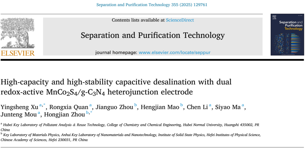 通过将双氧化还原活性中心与异质结构相结合,成功开发了一种MCS-CN复合异质结电极,实现高容量和高稳定性脱盐。该工作以“High-capacity and high-stability capacitive desalination with dual redox-active MnCo2S4/g-C3N4 heterojunction electrode”(双氧化还原活性MnCo2S4/g-C3N4异质结电极实现高容量高稳定性电容脱盐)为题,发表于Separation and Purification Technology(《分离纯化技术》)。徐应生博士为论文第一作者和通讯作者,中科院合肥研究院周宏建研究员为论文共同通讯作者,实验与数据处理部分由课题组2021级本科生全荣霞(论文第二作者)独立完成,湖北师范大学为论文第一单位。Separation and Purification Technology是Elsevier(爱思唯尔)出版社旗下工程技术领域期刊、SCI中科院大类一区期刊,最新影响因子为8.1。