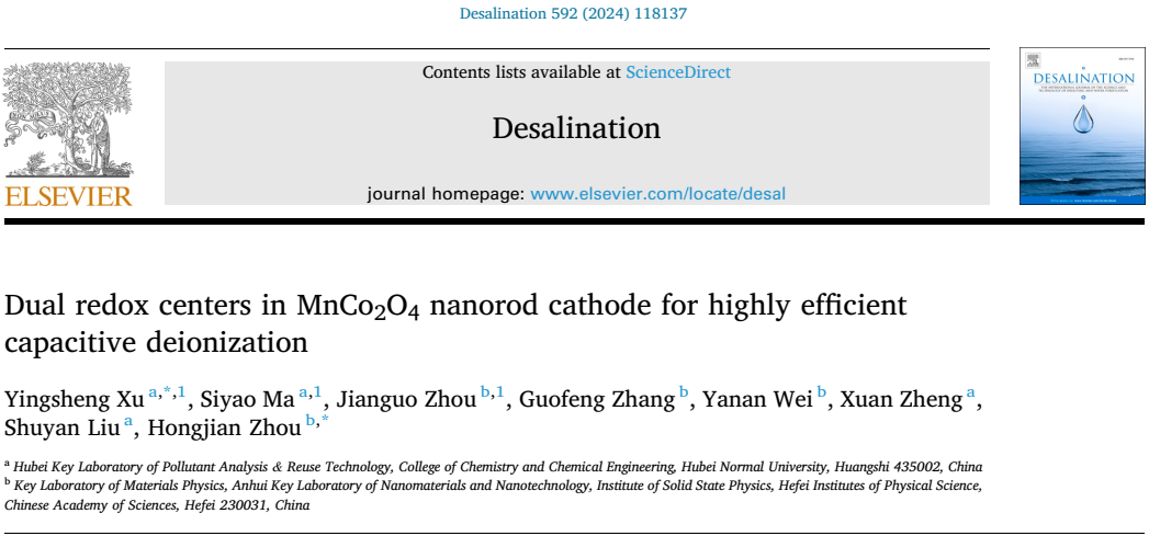 其中,基于法拉第转换机制与双氧化还原中心结合策略,发展了一种MnCo2O4纳米棒阴极材料。该工作以“Dual redox centers in MnCo2O4 nanorod cathode for highly efficient capacitive deionization”(基于MnCo2O4纳米棒阴极双重氧化还原中心的高效电容脱盐)为题,发表于Desalination(《脱盐》)。徐应生博士为论文第一作者和通讯作者,中科院合肥研究院周宏建研究员为论文共同通讯作者,实验与数据处理部分由课题组2021级本科生马斯窅(论文共同第一作者)独立完成,湖北师范大学为论文第一单位,该工作获得湖北省第十七届大学生化学(化工)学术创新成果报告会二等奖。Desalination系Elsevier(爱思唯尔)出版社旗下工程技术领域期刊、SCI中科院大类一区期刊,最新影响因子为8.3。