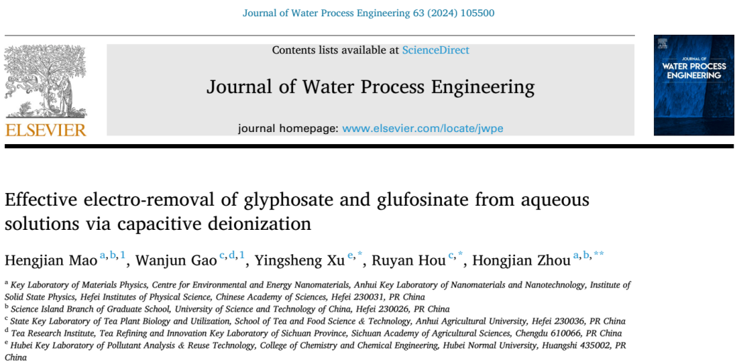 草铵膦(Gly)和草甘膦(Glu)都是常用的除草剂,其对环境和人类健康的影响引发担忧。通过原位电氧化与电容吸附的有效结合,碳基CDI技术实现了对水体中除草剂的分解和去除。该工作以“Effective electro-removal of glyphosate and glufosinate from aqueous solutions via capacitive deionization”为题发表在Journal of Water Process Engineering(《水处理工程杂志》)。betway西汉姆联官网徐应生博士、安徽农业大学侯如燕教授、中科院合肥研究院周宏建研究员为论文共同通讯作者,湖北师范大学为通讯单位之一。Journal of Water Process Engineering是Elsevier(爱思唯尔)出版社旗下工程技术领域期刊、SCI中科院大类二区期刊,最新影响因子为6.3。