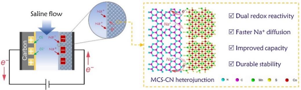 2. High-capacity and high-stability capacitive desalination with dual redox-active MnCo2S4/g-C3N4 heterojunction electrode