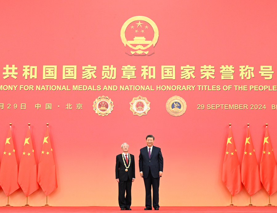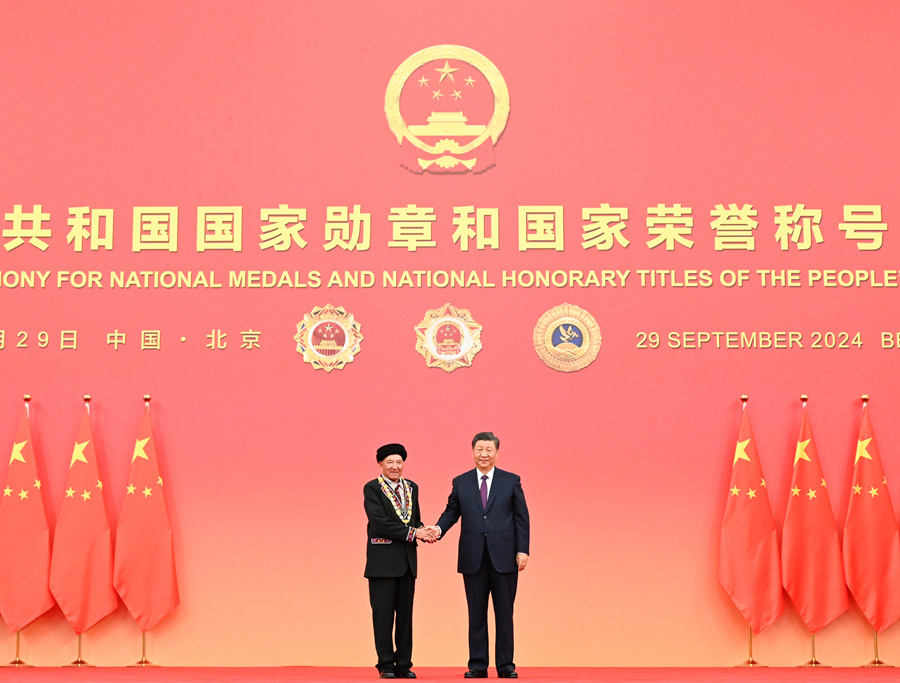 9月29日,中华人民共和国国家勋章和国家荣誉称号颁授仪式在北京人民大会堂金色大厅隆重举行。中共中央总书记、国家主席、中央军委主席习近平向国家勋章和国家荣誉称号获得者颁授勋章奖章并发表重要讲话。新华社记者 申宏 摄