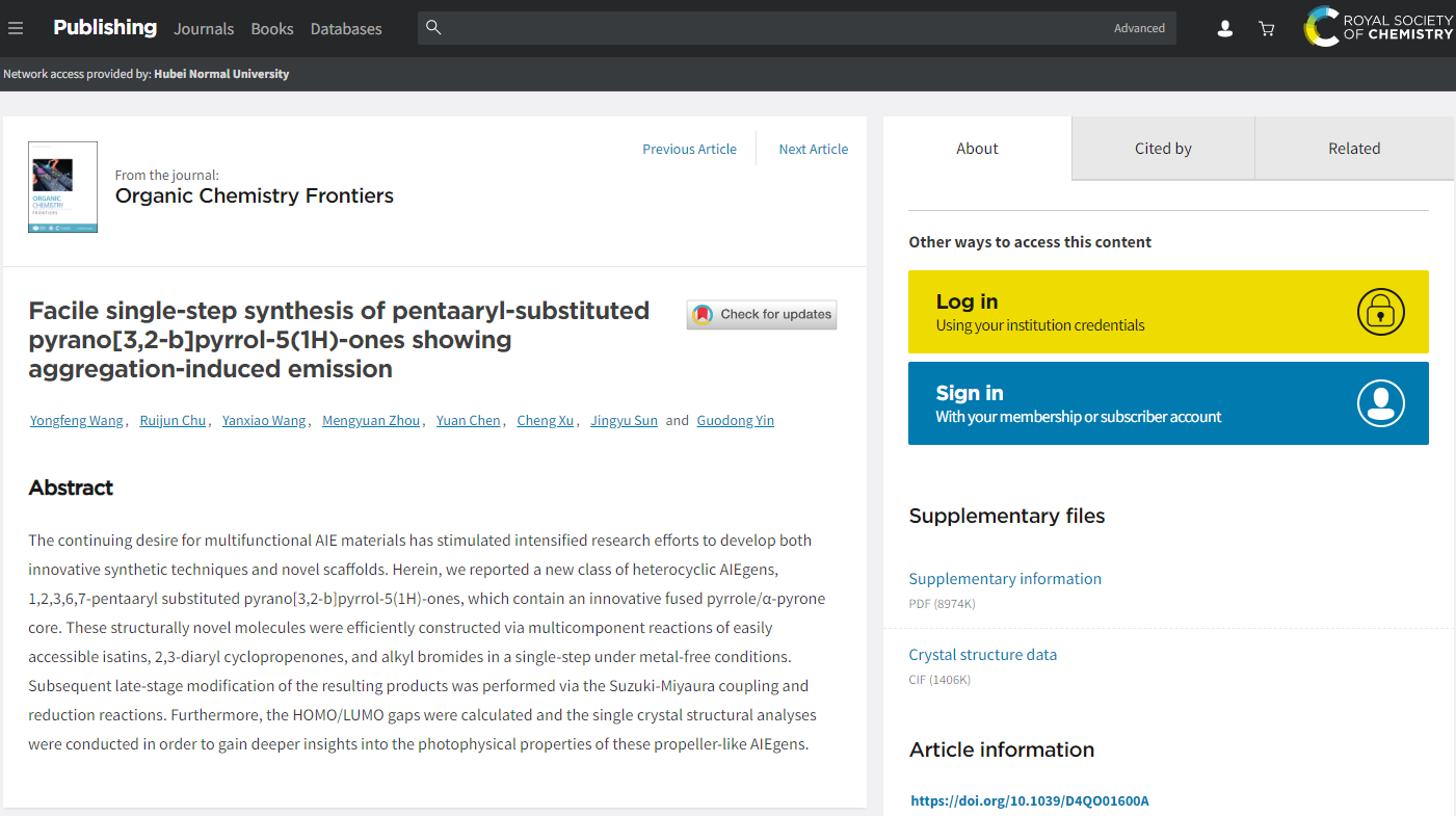 近日,国际知名期刊Organic Chemistry Frontiers(《有机化学前沿》)在线发表了我院殷国栋教授团队在新型有机功能分子合成领域的最新研究成果。论文题为Facile single-step synthesis of pentaaryl-substituted pyrano[3,2-b]pyrrol-5(1H)-ones showing aggregation-induced emission(简便单步合成具有聚集诱导发光效应的五芳基取代吡喃并[3,2-b]吡咯-5(1H)-酮)。2021级硕士研究生王永凤为论文第一作者,徐程博士和殷国栋教授为论文通讯作者,湖北师范大学为论文唯一通讯单位。Organic Chemistry Frontiers是Royal Society of Chemistry(英国皇家化学会)与中国化学会、中国科学院上海有机化学研究所合作出版,专注于CHEMISTRY, ORGANIC领域的学术期刊、SCI中科院大类一区期刊,最新影响因子为4.6。