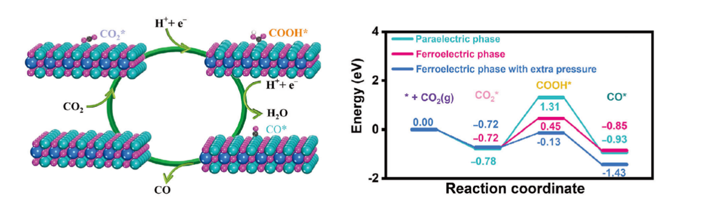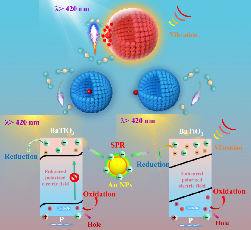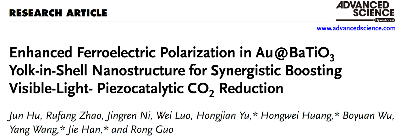 近日,我院赵茹芳博士与扬州大学胡俊博士合作,在国际知名期刊Advanced Science(《前沿科学》)上发表新型壳中核纳米催化剂Au@BaTiO3在压电光催化CO2转化还原中的最新研究成果。论文题为“Enhanced Ferroelectric Polarization in Au@BaTiO3 Yolk-in-Shell Nanostructure for Synergistic Boosting Visible-Light-Piezocatalytic CO2 Reduction”(新型Au@BaTiO3壳中核纳米结构中增强的铁电极化用于协同增强可见光-压电光催化CO2还原)。扬州大学胡俊博士为论文第一作者,我院赵茹芳博士为共同第一作者,扬州大学于洪鉴博士、汪洋教授、韩杰教授以及中国地质大学(北京)黄洪伟教授为共同通讯作者,湖北师范大学为论文第二通讯单位。赵茹芳博士负责机理解释和理论计算部分。Advanced Science是Wiley出版社旗下综合性期刊、SCI中科院大类一区期刊,最新影响因子为14.4。