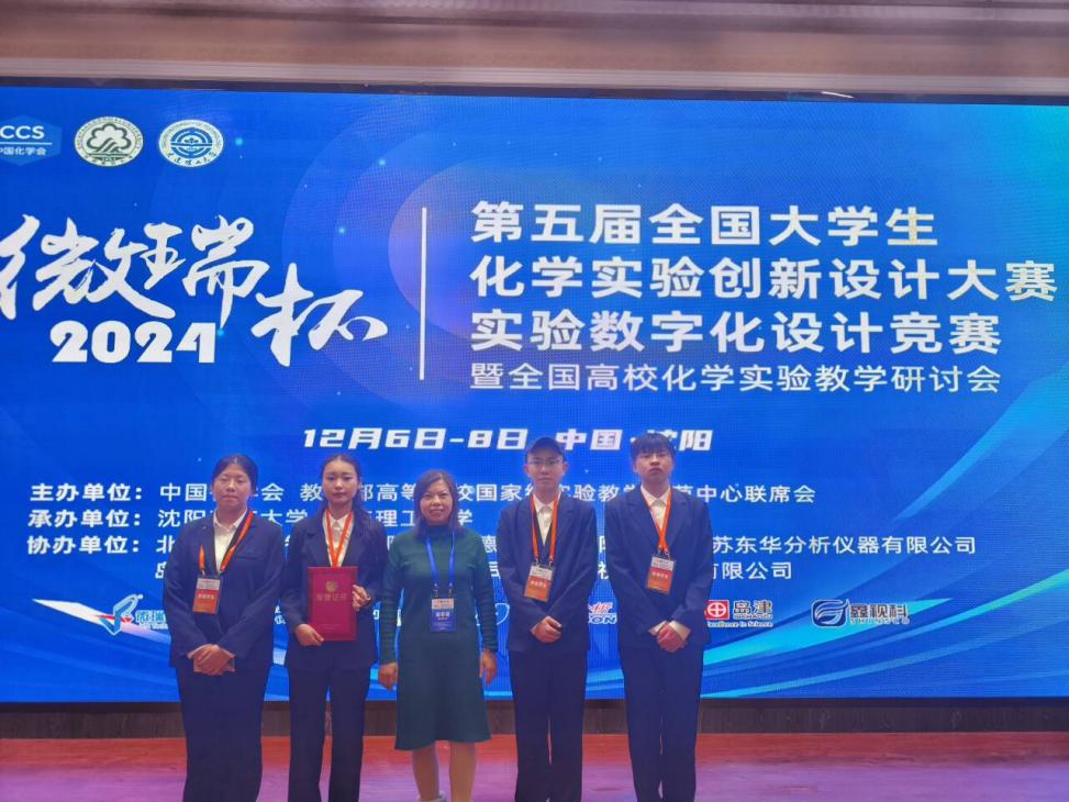 第五届全国大学生化学实验创新设计大赛-实验数字化设计竞赛于12月6-8日在沈阳师范大学举行,赛事由中国化学会、教育部高等学校国家级实验教学示范中心联席会主办,沈阳师范大学和大连理工大学联合承办。我院化学专业2202班饶玉、高佳丽、周奇、刘尧及计算机与信息工程学院通信工程专业2105班邢亮5名同学组建的湖北师范大学三队通过激烈角逐进入全国总决赛,获得全国二等奖,指导老师为我院物理化学教研室程翠霞副教授和计算机与信息工程学院黄琳老师。