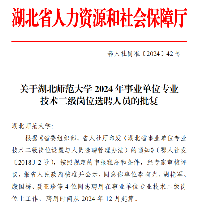 12月30日,根据湖北省人力资源和社会保障厅批复(鄂人社岗准〔2024〕42 号),我院胡艳军、殷国栋2名教授晋升为二级教授,至此,我院在岗二级教授达到6人(含返聘2人)。