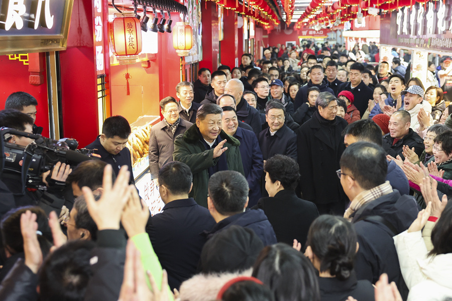 社区党群服务中心里,一些社区居民在写春联,孩子们编着中国结。习近平来到他们中间,不时赞赏他们的作品,勉励他们更好传承弘扬中华优秀传统文化。习近平还饶有兴致地欣赏了社区退休人员表演的笛子合奏曲。他深情地对大家说,过好春节意味着新一年有一个好的开端,家家户户幸福生活、老老少少开心快乐,就是人间美景。我们要一起努力,让这美景越来越靓丽。