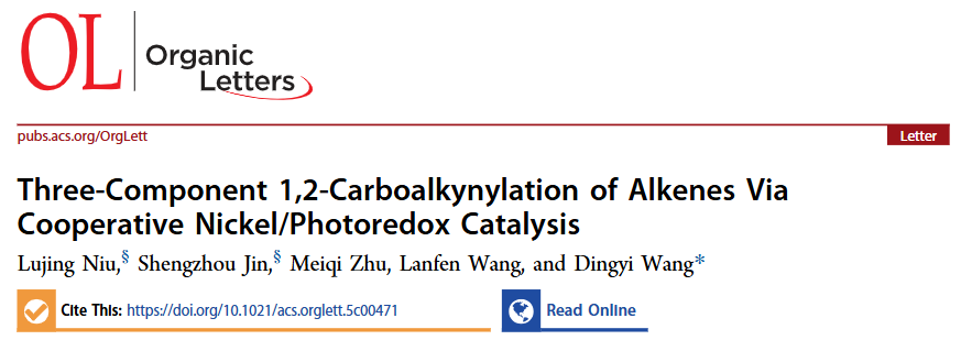 第二篇论文的题目为“Three-Component 1,2-Carboalkynylation of Alkenes via Cooperative Nickelaphotoredox Catalysis”(光氧化还原和镍协同催化烯烃的三组分1,2-碳炔基化)。金胜周博士为论文共同第一作者,湖北师范大学为第二通讯单位,东北大学王丁意教授为论文通讯作者。