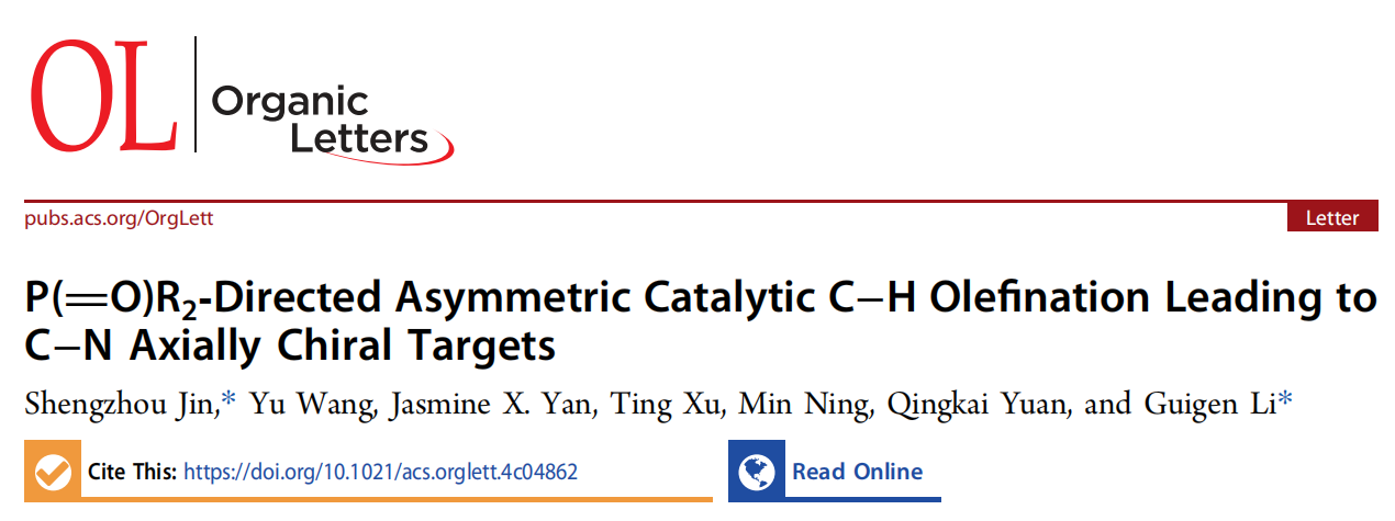 第一篇论文的题目为“P(=O)R2-Directed Asymmetric Catalytic C−H Olefination Leading to C−N Axially Chiral Targets”(磷氧基导向C-H键活化构建C-N键轴手性的产物)。该论文被编辑部选中为封面文章,金胜周博士为该论文的第一作者和第一通讯作者,湖北师范大学为第一通讯单位,美国德州理工大学/南京大学李桂根教授为论文共同通讯作者。