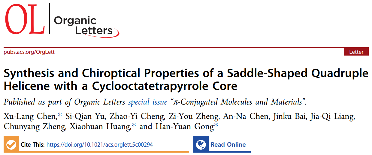 第二篇论文题为“Synthesis and Chiroptical Properties of a Saddle-Shaped Quadruple Helicene with a Cyclooctatetrapyrrole Core”(具有环辛四吡咯核心的鞍形四螺烯的合成及其手性光学性质)。陈绪朗博士为论文第一作者兼通讯作者,黄小欢教授和北京师范大学龚汉元教授为论文共同通讯作者,湖北师范大学为论文第一通讯单位。