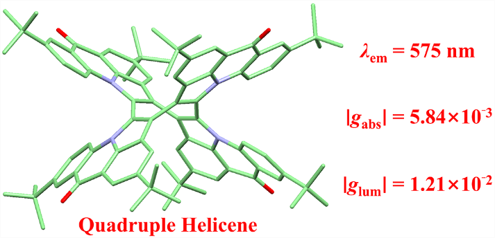 螺烯是一类通过多个苯环或其他芳香体系邻位稠合而成的螺旋状手性化合物,因其螺旋手性和圆偏振发光(CPL)特性而备受关注。具备π共轭骨架和三维鞍形几何结构的环辛四芳基化合物是构筑新型螺烯的理想核心结构。在该项研究中,他们使用简单的一步催化偶联方法,成功合成了一种新型的以环辛四吡咯为核心且具有良好圆偏振发光(CPL)性能的四螺烯(COT-PAO)。外围吖啶酮基团的引入赋予了其鞍形的分子结构。对映纯的COT-PAO展现出显著的手性性质,其吸收不对称因子(∣gabs∣)为5.84×10⁻³,发光不对称因子(∣glum∣)达到了1.21×10⁻²。该项工作是具有环辛四烯基四芳基核心且展现出圆偏振发光性能的四螺旋烯的罕见实例,突显了它们在圆偏振发光应用方面的潜力。此外,该研究为具有圆偏振发光性质的螺烯提供了一种新的合成方法,且这些研究成果有可能为高性能圆偏振发光材料的发展做出贡献。