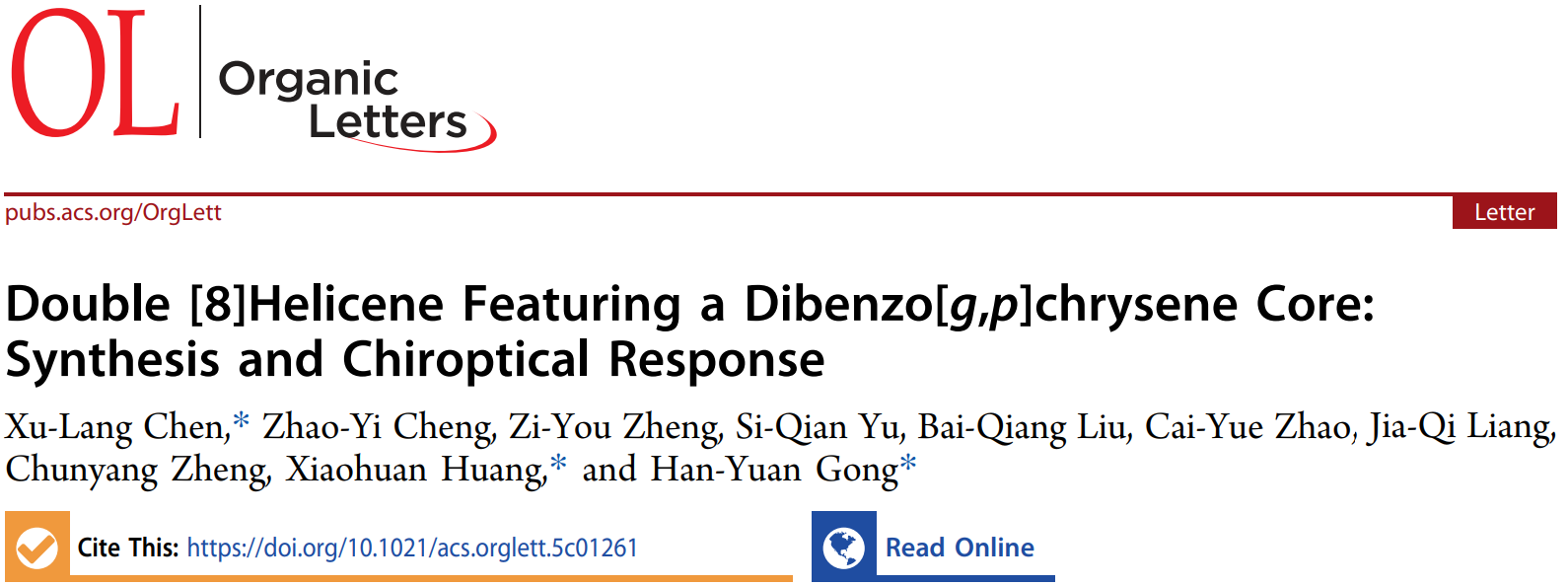 近日,Organic Letters(《有机化学通讯》)在线发表了有机化学教研室陈绪朗博士的最新研究成果,论文题为“Double [8]Helicene Featuring a Dibenzo[g,p]chrysene Core: Synthesis and Chiroptical Response”(以二苯并[g,p]屈为核心的双[8]螺旋烯:合成及手性光学响应)。陈绪朗博士为论文第一作者兼通讯作者,黄小欢教授和北京师范大学龚汉元教授为论文共同通讯作者,湖北师范大学为论文第一通讯单位。这是该博士今年在非平面共轭分子领域发表的第三篇高水平论文。