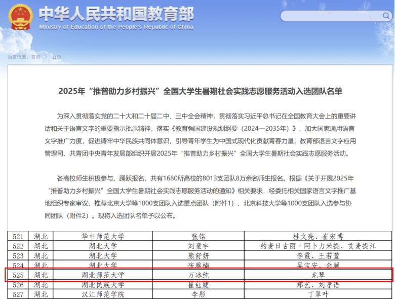 青苗语润实践队入选2025年“推普助力乡村振兴”全国大学生暑期社会实践志愿服务重点团队,全国共1000支团队入选重点团队。该活动由教育部语言文字应用管理司、共青团中央青年发展部共同组织开展,旨在加大国家通用语言文字推广力度,促进铸牢中华民族共同体意识,引导青年学生为中国式现代化贡献青春力量。我院以《少数民族聚居区国家通用语言认同与使用现状调研》为题进行申报,将开展“推普+语言调查”实地调研。指导老师为辅导员龙琴,化学(优师)2207班万冰纯同学为队长。