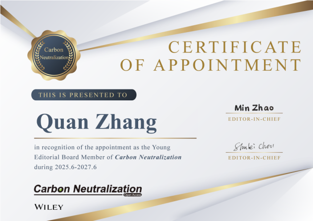 近日,无机化学教研室张权博士受聘为国际期刊Carbon Neutralization和EcoEnergy青年编委,聘期2年。