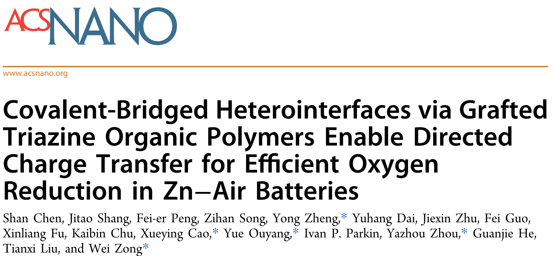 近日,国际知名期刊ACS Nano(《美国化学学会—纳米》)在线发表了物理化学教研室陈山博士团队在电催化氧还原(ORR)领域的最新研究成果。论文题为“Covalent–Bridged Heterointerfaces via Grafted Triazine Organic Polymers Enable Directed Charge Transfer for Efficient Oxygen Reduction in Zn–Air Batteries”(共价桥连异质界面增强氧还原反应电子定向转移用于锌-空气电池)。陈山博士为论文第一作者,三峡大学郑勇博士、临沂大学曹雪莹博士、英国伦敦大学学院欧阳玥博士、德国马克斯普朗克聚合物研究所周亚洲博士和牛津大学宗伟博士为论文共同通讯作者,湖北师范大学为论文第一通讯单位。ACS Nano是American Chemical Society(美国化学学会)出版社旗下材料科学领域TOP期刊、SCI中科院大类一区,最新影响因子为16.0。