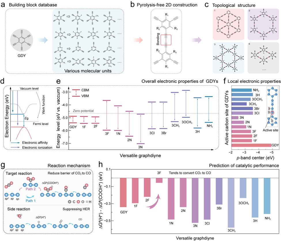 在材料科学领域,实现按需设计、结构可控的材料一直是科研界的长期目标。然而,传统材料结构往往复杂,难以建立统一的设计原则,从而限制了性能的进一步优化。近日,该研究团队以模块化石墨炔(Graphdiyne, GDY)为研究平台,提出了一种基于化学分子设计的可定制框架,实现了原子级精准调控催化行为的新策略。通过密度泛函理论(DFT)计算与实验验证相结合,系统引入电子给体和受体基团,构建了13种有机分子单元,制备出一系列具有预设结构的模块化GDY材料。这种“积木式”分子设计思路使研究者能够清晰地解析结构与催化性能之间的关系,为设计高效催化剂提供了可操作的理论依据。研究发现,活性炔碳的氧化态与CO2电还原反应(CO2RR)活性呈现典型的“火山型”关联。进一步的电子结构分析表明,氧化态与材料的功函数、价带顶(VBM)以及费米能级(En)等关键参数密切相关,从而建立了一个可预测的性能调控框架。通过精确调控sp碳的氧化态,团队实现了CO2还原与析氢反应(HER)之间的平衡突破,使产物中CO/H2比可从1:10灵活调至13:1。这项研究不仅揭示了石墨炔材料结构—性能之间的关系,还提出了一种可模块化设计的新思路,为未来高效合成气生产与可持续能源转化提供了的理论基础。