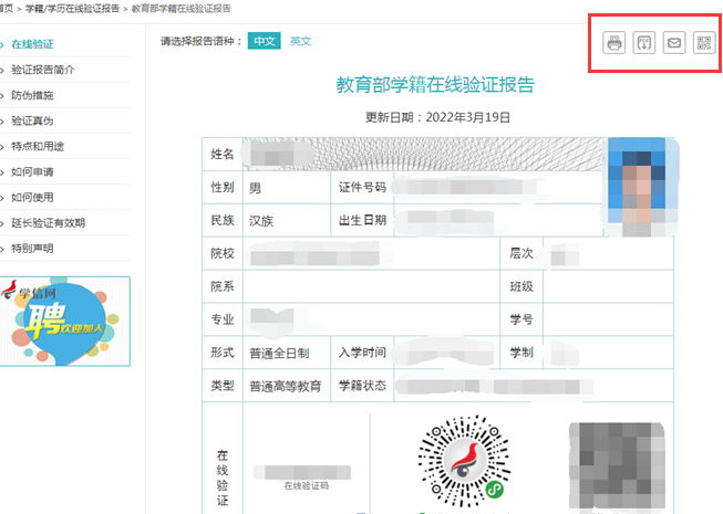 4. 点击查看即可在右上角,查看并下载或打印相关报告,在线验证报告有对应的验证码,也有验证二维码,可以通过此查询验证。